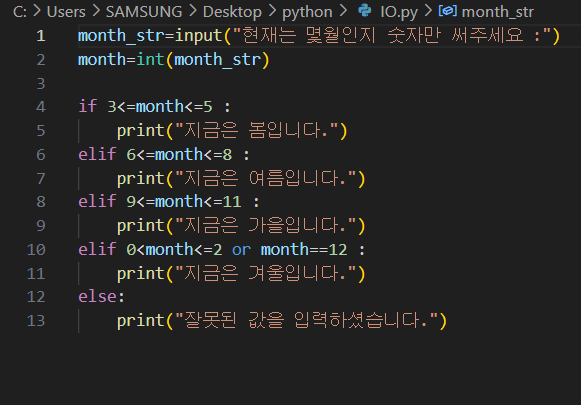 *파이썬은 if와 else 내부의 실행할 코드를 적어주는데 이를 들여쓰기로 구분하는것은 매우 중요하다.