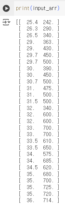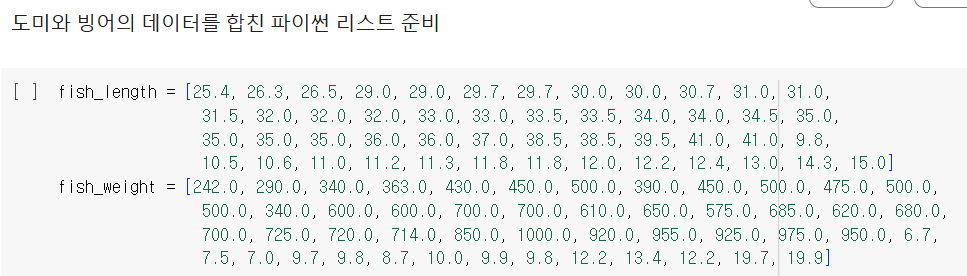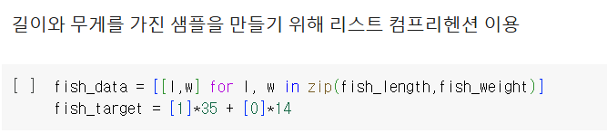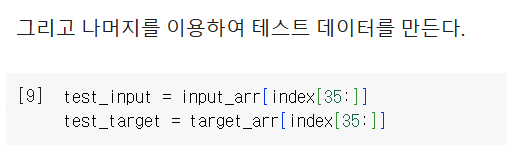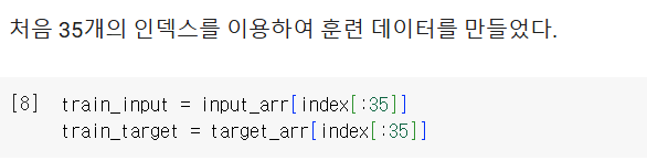 훈련과 데이터 세트를 나눴을 때 앞쪽은 도미, 뒷쪽은 빙어가 있게 된다.