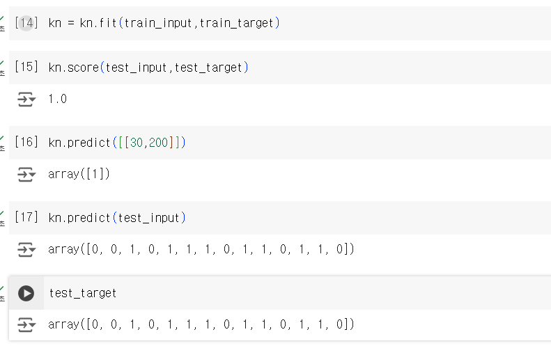 전과 같이 k-최근접 이웃 모델을 훈련시켜 사용해보니