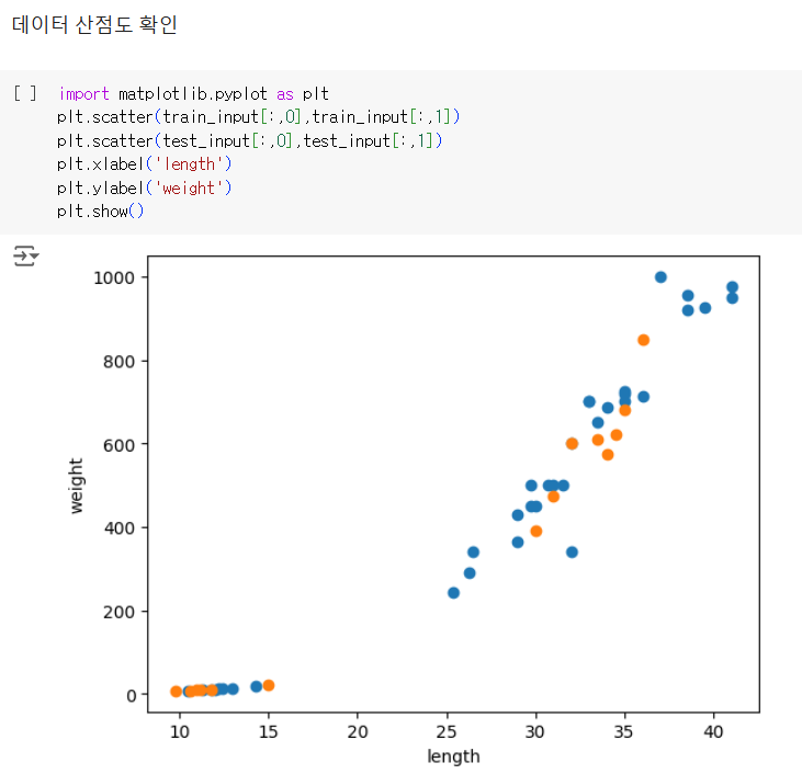 이런 상태에서 뒤를 타겟 데이터로 지정하면 충분한 빙어 데이터가 들어가지 않기에 정답을 맞출 수가 없다.